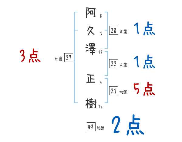 天運![]() | 阿久澤正樹さんの天運は28画の1つ星!家庭環境に注意。スポーツで活躍できる能力があるかも。 家系が持つ宿命的な運勢を表します。祖先から受け継いだ苗字ですので自分の力が及びません。家柄を象徴します。 |