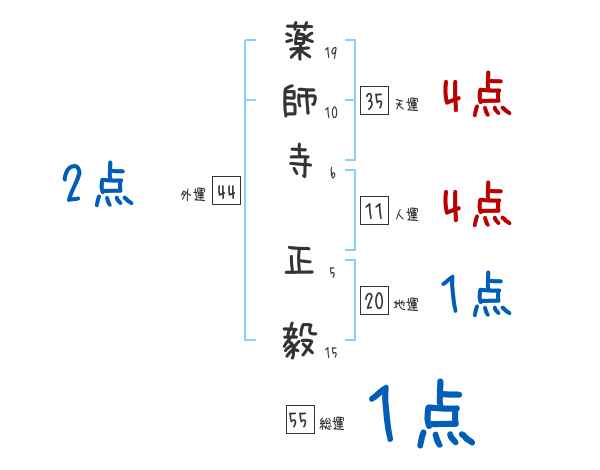 外運![]() | 薬師寺正毅さんの外運は44画の2つ星!誠実で慎重な性格。物事を考えすぎないように注意しましょう。 生活面を象徴する運勢です。外部から受ける影響力を表し、結婚運、家庭運や職場、環境への順応性を表します。 |