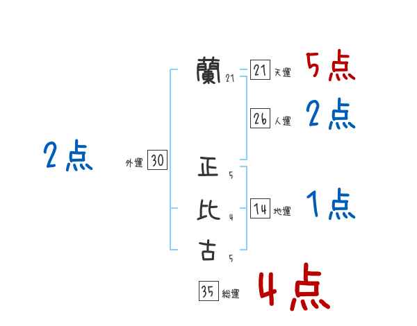 天運![]() | 蘭正比古さんの天運は21画の5つ星!統率力がある。独立し成功する。名誉を手に入れる。 家系が持つ宿命的な運勢を表します。祖先から受け継いだ苗字ですので自分の力が及びません。家柄を象徴します。 |