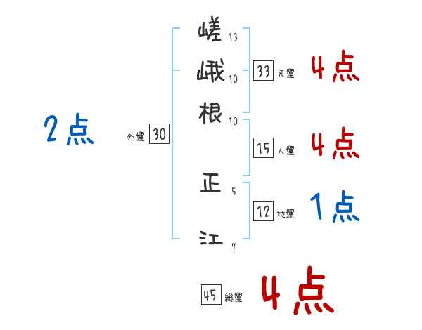 天運![]() | 嵯峨根正江さんの天運は33画の4つ星!権力志向でプライドが高い。勇気があり運を切り開き成功する。 家系が持つ宿命的な運勢を表します。祖先から受け継いだ苗字ですので自分の力が及びません。家柄を象徴します。 |