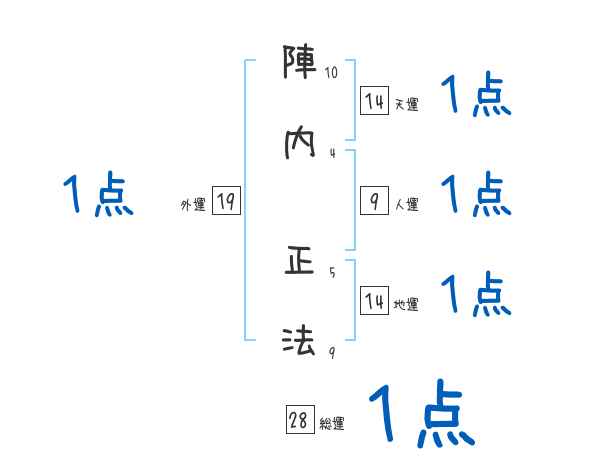 天運![]() | 陣内正法さんの天運は14画の1つ星!人に対して優しいがストレスを溜め込みがち。人間関係のトラブルを避けるよう気をつけましょう。 家系が持つ宿命的な運勢を表します。祖先から受け継いだ苗字ですので自分の力が及びません。家柄を象徴します。 |