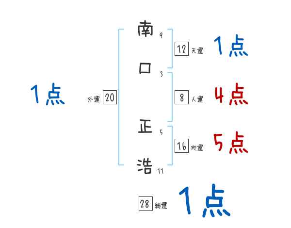 総運![]() | 南口正浩さんの総運は28画の1つ星!家庭環境に注意。スポーツで活躍できる能力があるかも。 あなたの人生を表す1番重要な運勢です。生涯を通じて影響する総合運となり、主に50歳以降の晩年期に影響を及ぼします。 |