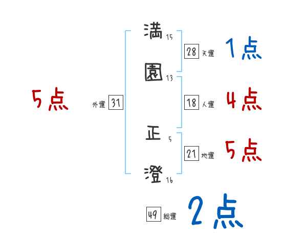 外運![]() | 満園正澄さんの外運は31画の5つ星!社交性があり判断力に優れる。順風満帆な人生で円満な生活。 生活面を象徴する運勢です。外部から受ける影響力を表し、結婚運、家庭運や職場、環境への順応性を表します。 |