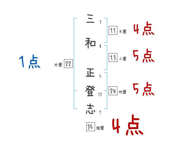 | 天運  | 三和正登志さんの天運は11画の4つ星!着実に富や地位を得る幸運な人生。家系が持つ宿命的な運勢を表します。祖先から受け継いだ苗字ですので自分の力が及びません。家柄を象徴します。 |