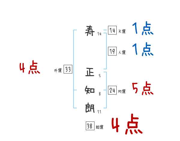 天運![]() | 寿正知朗さんの天運は14画の1つ星!人に対して優しいがストレスを溜め込みがち。人間関係のトラブルを避けるよう気をつけましょう。 家系が持つ宿命的な運勢を表します。祖先から受け継いだ苗字ですので自分の力が及びません。家柄を象徴します。 |