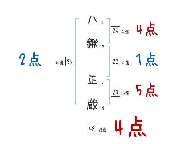 天運![]() | 八鍬正蔵さんの天運は25画の4つ星!個性があり才能があふれる。強運の持ち主で発展する。 家系が持つ宿命的な運勢を表します。祖先から受け継いだ苗字ですので自分の力が及びません。家柄を象徴します。 |