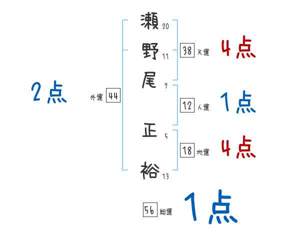 外運![]() | 瀬野尾正裕さんの外運は44画の2つ星!誠実で慎重な性格。物事を考えすぎないように注意しましょう。 生活面を象徴する運勢です。外部から受ける影響力を表し、結婚運、家庭運や職場、環境への順応性を表します。 |