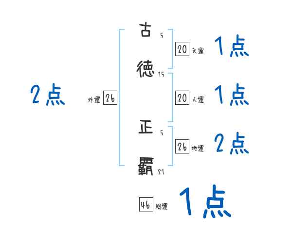 地運![]() | 古徳正覇さんの地運は26画の2つ星!波瀾万丈かも。信頼できる人を大事にしましょう。 個性を表す基礎的な運勢です。性格形成や対人関係、行動力など家庭環境に影響されます。主に誕生してから20歳くらいまでの若年期の運勢を表します。 |