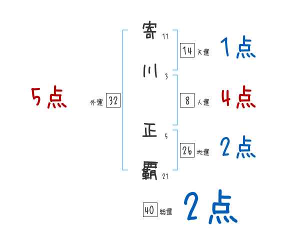 外運![]() | 寄川正覇さんの外運は32画の5つ星!柔軟性があり成功する。チャンスが多く金運が良い。 生活面を象徴する運勢です。外部から受ける影響力を表し、結婚運、家庭運や職場、環境への順応性を表します。 |