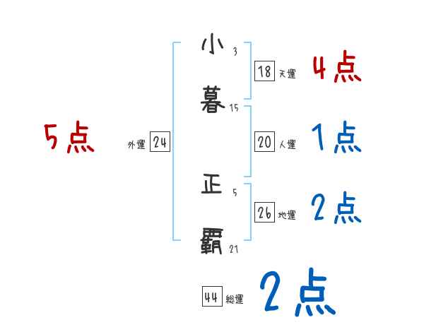 外運![]() | 小暮正覇さんの外運は24画の5つ星!家庭運が良く順調な人生。金運にも恵まれる。 生活面を象徴する運勢です。外部から受ける影響力を表し、結婚運、家庭運や職場、環境への順応性を表します。 |