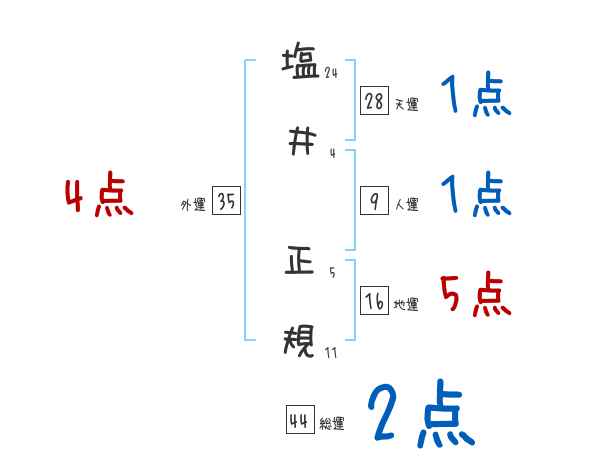 外運![]() | 塩井正規さんの外運は35画の4つ星!温厚な性格で感受性が高い。穏和な性格で人望が厚い。 生活面を象徴する運勢です。外部から受ける影響力を表し、結婚運、家庭運や職場、環境への順応性を表します。 |