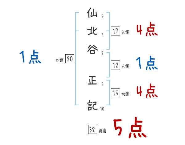 総運![]() | 仙北谷正記さんの総運は32画の5つ星!柔軟性があり成功する。チャンスが多く金運が良い。 あなたの人生を表す1番重要な運勢です。生涯を通じて影響する総合運となり、主に50歳以降の晩年期に影響を及ぼします。 |