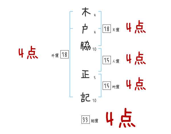外運![]() | 木戸脇正記さんの外運は18画の4つ星!情熱的で剛気。忍耐力があり信頼される。 生活面を象徴する運勢です。外部から受ける影響力を表し、結婚運、家庭運や職場、環境への順応性を表します。 |