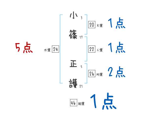 外運![]() | 小篠正護さんの外運は24画の5つ星!家庭運が良く順調な人生。金運にも恵まれる。 生活面を象徴する運勢です。外部から受ける影響力を表し、結婚運、家庭運や職場、環境への順応性を表します。 |