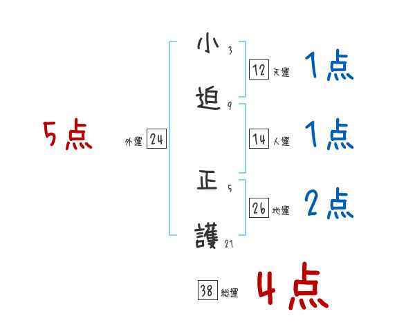 外運![]() | 小迫正護さんの外運は24画の5つ星!家庭運が良く順調な人生。金運にも恵まれる。 生活面を象徴する運勢です。外部から受ける影響力を表し、結婚運、家庭運や職場、環境への順応性を表します。 |