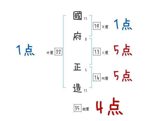 天運![]() | 國府正造さんの天運は19画の1つ星!優れた才能を持ちますが、協調性が足りないことも。周りの人と協力する事を意識しましょう。 家系が持つ宿命的な運勢を表します。祖先から受け継いだ苗字ですので自分の力が及びません。家柄を象徴します。 |