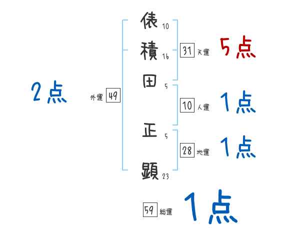 外運![]() | 俵積田正顕さんの外運は49画の2つ星!不安定な性格で明暗がある人生。周りの人には支援されやすい。 生活面を象徴する運勢です。外部から受ける影響力を表し、結婚運、家庭運や職場、環境への順応性を表します。 |