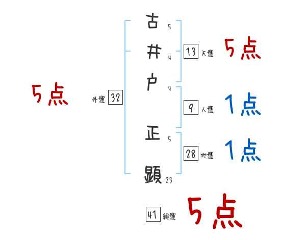 外運![]() | 古井戸正顕さんの外運は32画の5つ星!柔軟性があり成功する。チャンスが多く金運が良い。 生活面を象徴する運勢です。外部から受ける影響力を表し、結婚運、家庭運や職場、環境への順応性を表します。 |