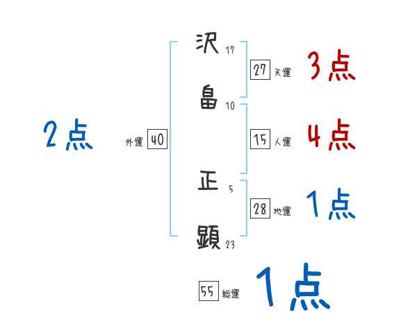 天運![]() | 沢畠正顕さんの天運は27画の3つ星!頭脳明晰だが強情で摩擦が多い傾向。孤立に注意。 家系が持つ宿命的な運勢を表します。祖先から受け継いだ苗字ですので自分の力が及びません。家柄を象徴します。 |