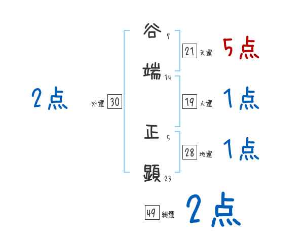 天運![]() | 谷端正顕さんの天運は21画の5つ星!統率力がある。独立し成功する。名誉を手に入れる。 家系が持つ宿命的な運勢を表します。祖先から受け継いだ苗字ですので自分の力が及びません。家柄を象徴します。 |