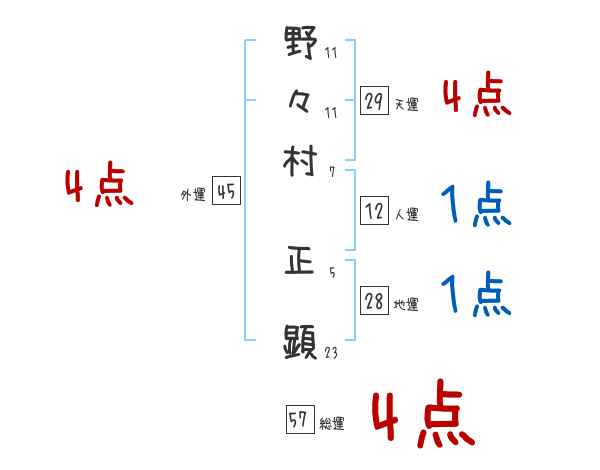 天運![]() | 野々村正顕さんの天運は29画の4つ星!完全主義で才能がある。厳格な心の持ち主。 家系が持つ宿命的な運勢を表します。祖先から受け継いだ苗字ですので自分の力が及びません。家柄を象徴します。 |