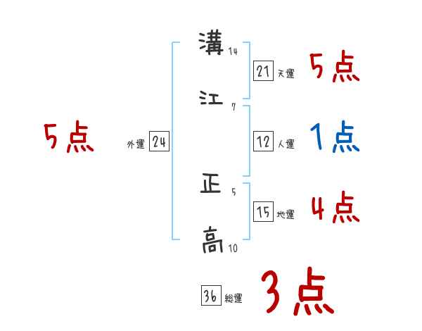 外運![]() | 溝江正高さんの外運は24画の5つ星!家庭運が良く順調な人生。金運にも恵まれる。 生活面を象徴する運勢です。外部から受ける影響力を表し、結婚運、家庭運や職場、環境への順応性を表します。 |