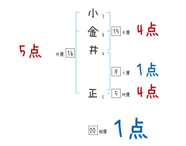 外運![]() | 小金井正さんの外運は16画の5つ星!人望が厚く大きく発展する。逆転成功が見える。 生活面を象徴する運勢です。外部から受ける影響力を表し、結婚運、家庭運や職場、環境への順応性を表します。 |