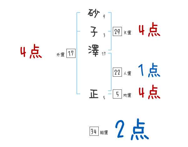 総運![]() | 砂子澤正さんの総運は34画の2つ星!独創性に優れるが、自尊心が強く災難に注意しましょう。 あなたの人生を表す1番重要な運勢です。生涯を通じて影響する総合運となり、主に50歳以降の晩年期に影響を及ぼします。 |