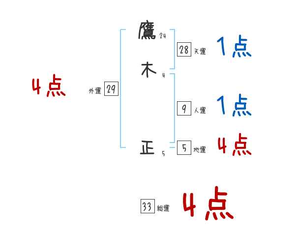 外運![]() | 鷹木正さんの外運は29画の4つ星!完全主義で才能がある。厳格な心の持ち主。 生活面を象徴する運勢です。外部から受ける影響力を表し、結婚運、家庭運や職場、環境への順応性を表します。 |