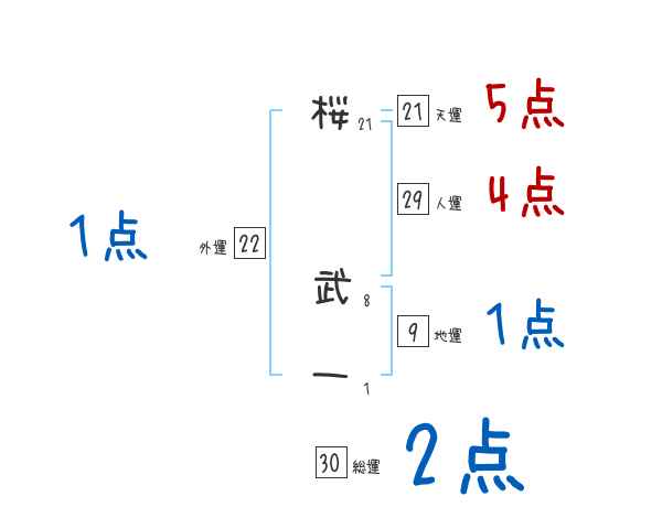 天運![]() | 桜武一さんの天運は21画の5つ星!統率力がある。独立し成功する。名誉を手に入れる。 家系が持つ宿命的な運勢を表します。祖先から受け継いだ苗字ですので自分の力が及びません。家柄を象徴します。 |