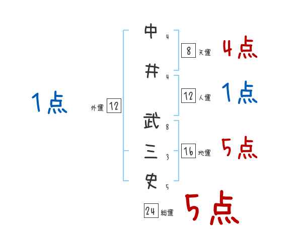 総運![]() | 中井武三史さんの総運は24画の5つ星!家庭運が良く順調な人生。金運にも恵まれる。 あなたの人生を表す1番重要な運勢です。生涯を通じて影響する総合運となり、主に50歳以降の晩年期に影響を及ぼします。 |