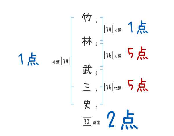 外運![]() | 竹林武三史さんの外運は14画の1つ星!人に対して優しいがストレスを溜め込みがち。人間関係のトラブルを避けるよう気をつけましょう。 生活面を象徴する運勢です。外部から受ける影響力を表し、結婚運、家庭運や職場、環境への順応性を表します。 |
