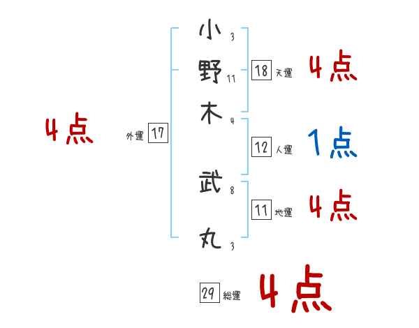 外運![]() | 小野木武丸さんの外運は17画の4つ星!積極的な行動力。地位を気づき財産を手に入れる。純粋な心と直感力。 生活面を象徴する運勢です。外部から受ける影響力を表し、結婚運、家庭運や職場、環境への順応性を表します。 |