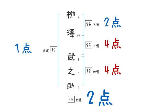 総運![]() | 栁澤武之助さんの総運は44画の2つ星!誠実で慎重な性格。物事を考えすぎないように注意しましょう。 あなたの人生を表す1番重要な運勢です。生涯を通じて影響する総合運となり、主に50歳以降の晩年期に影響を及ぼします。 |