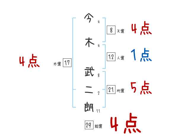 外運![]() | 今木武二朗さんの外運は17画の4つ星!積極的な行動力。地位を気づき財産を手に入れる。純粋な心と直感力。 生活面を象徴する運勢です。外部から受ける影響力を表し、結婚運、家庭運や職場、環境への順応性を表します。 |