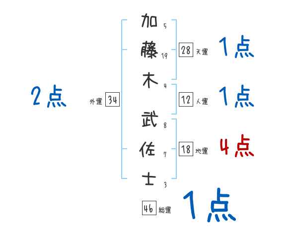 天運![]() | 加藤木武佐士さんの天運は28画の1つ星!家庭環境に注意。スポーツで活躍できる能力があるかも。 家系が持つ宿命的な運勢を表します。祖先から受け継いだ苗字ですので自分の力が及びません。家柄を象徴します。 |