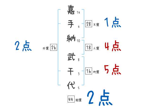 天運![]() | 嘉手納武千代さんの天運は28画の1つ星!家庭環境に注意。スポーツで活躍できる能力があるかも。 家系が持つ宿命的な運勢を表します。祖先から受け継いだ苗字ですので自分の力が及びません。家柄を象徴します。 |