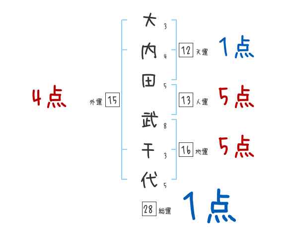 地運![]() | 大内田武千代さんの地運は16画の5つ星!人望が厚く大きく発展する。逆転成功が見える。 個性を表す基礎的な運勢です。性格形成や対人関係、行動力など家庭環境に影響されます。主に誕生してから20歳くらいまでの若年期の運勢を表します。 |