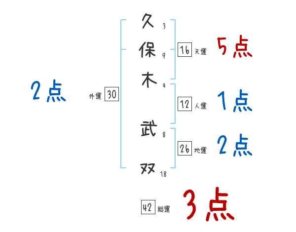 外運![]() | 久保木武双さんの外運は30画の2つ星!浮き沈みの激しさに注意しましょう。 生活面を象徴する運勢です。外部から受ける影響力を表し、結婚運、家庭運や職場、環境への順応性を表します。 |