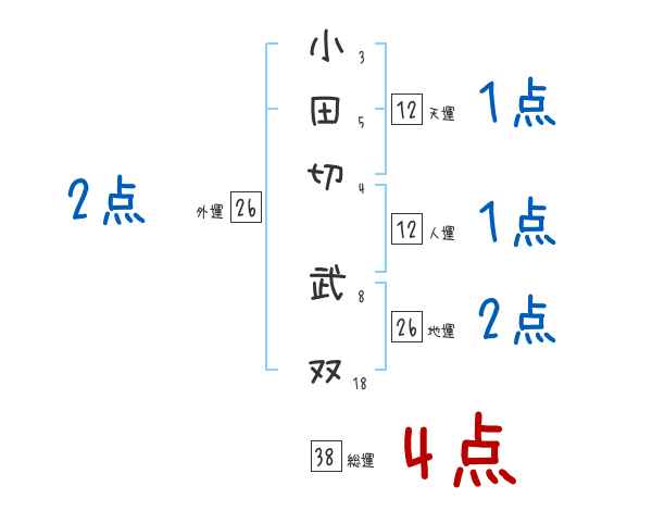 外運![]() | 小田切武双さんの外運は26画の2つ星!波瀾万丈かも。信頼できる人を大事にしましょう。 生活面を象徴する運勢です。外部から受ける影響力を表し、結婚運、家庭運や職場、環境への順応性を表します。 |