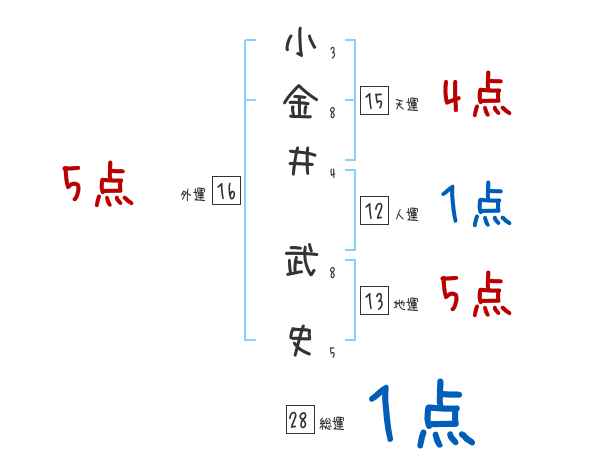 総運![]() | 小金井武史さんの総運は28画の1つ星!家庭環境に注意。スポーツで活躍できる能力があるかも。 あなたの人生を表す1番重要な運勢です。生涯を通じて影響する総合運となり、主に50歳以降の晩年期に影響を及ぼします。 |