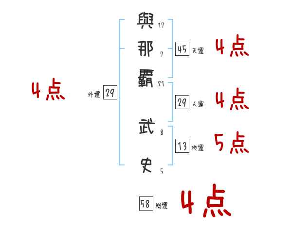外運![]() | 與那覇武史さんの外運は29画の4つ星!完全主義で才能がある。厳格な心の持ち主。 生活面を象徴する運勢です。外部から受ける影響力を表し、結婚運、家庭運や職場、環境への順応性を表します。 |