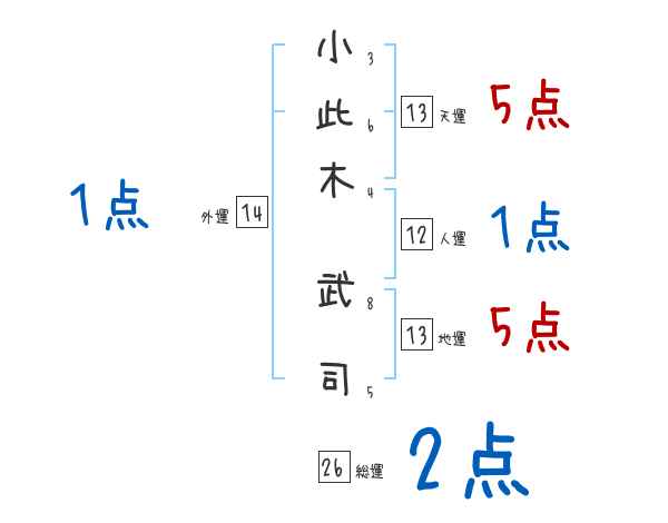 外運![]() | 小此木武司さんの外運は14画の1つ星!人に対して優しいがストレスを溜め込みがち。人間関係のトラブルを避けるよう気をつけましょう。 生活面を象徴する運勢です。外部から受ける影響力を表し、結婚運、家庭運や職場、環境への順応性を表します。 |