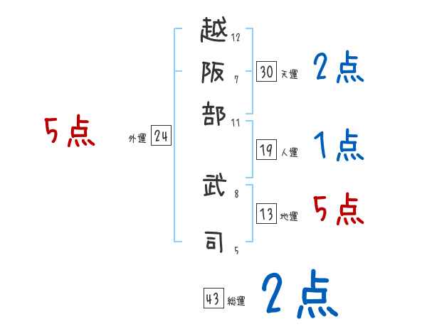 外運![]() | 越阪部武司さんの外運は24画の5つ星!家庭運が良く順調な人生。金運にも恵まれる。 生活面を象徴する運勢です。外部から受ける影響力を表し、結婚運、家庭運や職場、環境への順応性を表します。 |
