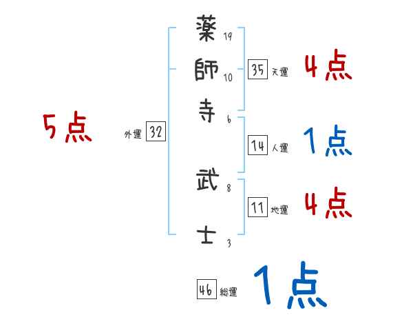 外運![]() | 薬師寺武士さんの外運は32画の5つ星!柔軟性があり成功する。チャンスが多く金運が良い。 生活面を象徴する運勢です。外部から受ける影響力を表し、結婚運、家庭運や職場、環境への順応性を表します。 |