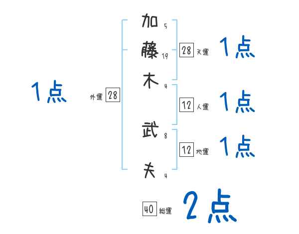天運![]() | 加藤木武夫さんの天運は28画の1つ星!家庭環境に注意。スポーツで活躍できる能力があるかも。 家系が持つ宿命的な運勢を表します。祖先から受け継いだ苗字ですので自分の力が及びません。家柄を象徴します。 |