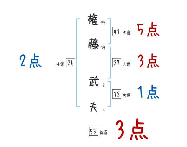 総運![]() | 権藤武夫さんの総運は53画の3つ星!やや見栄っ張りで虚栄心がある。散財に注意。 あなたの人生を表す1番重要な運勢です。生涯を通じて影響する総合運となり、主に50歳以降の晩年期に影響を及ぼします。 |