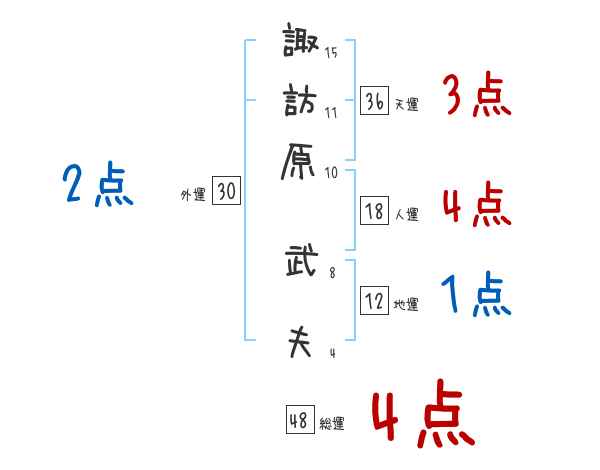 天運![]() | 諏訪原武夫さんの天運は36画の3つ星!先見性が豊かです。多少神経質で苦労することも。 家系が持つ宿命的な運勢を表します。祖先から受け継いだ苗字ですので自分の力が及びません。家柄を象徴します。 |