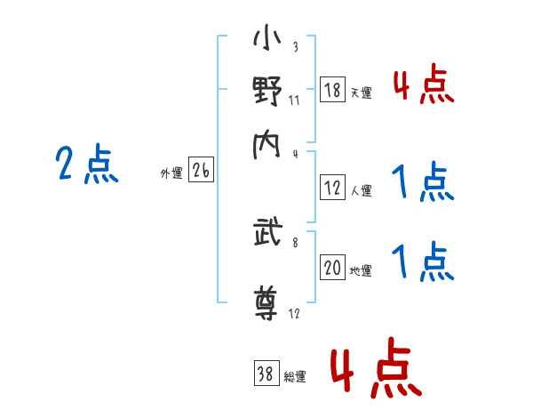 天運![]() | 小野内武尊さんの天運は18画の4つ星!情熱的で剛気。忍耐力があり信頼される。 家系が持つ宿命的な運勢を表します。祖先から受け継いだ苗字ですので自分の力が及びません。家柄を象徴します。 |
