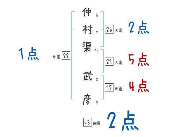 外運![]() | 仲村渠武彦さんの外運は22画の1つ星!努力することが苦手ないっぽう手先が器用。芸術性にも優れる。 生活面を象徴する運勢です。外部から受ける影響力を表し、結婚運、家庭運や職場、環境への順応性を表します。 |